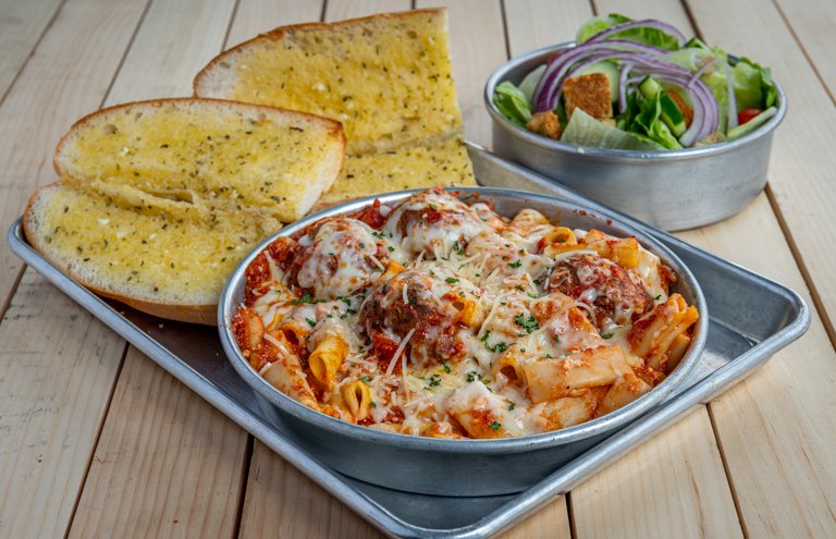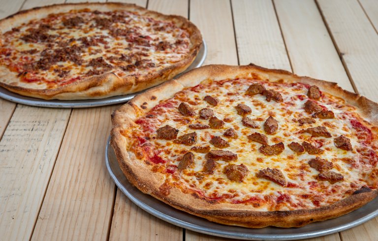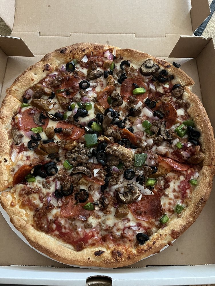 Homemade pizza sauce topped with pepperoni, sausage, red onions, bacon,jalapeno peppers, crushed red hots, and mozzarella cheese.