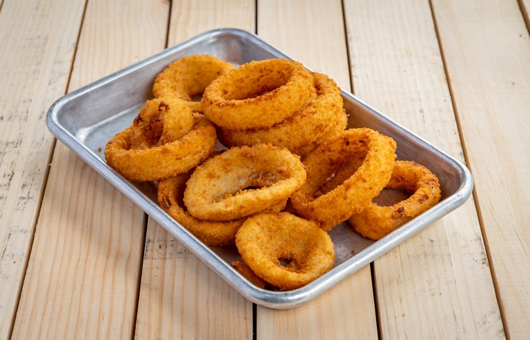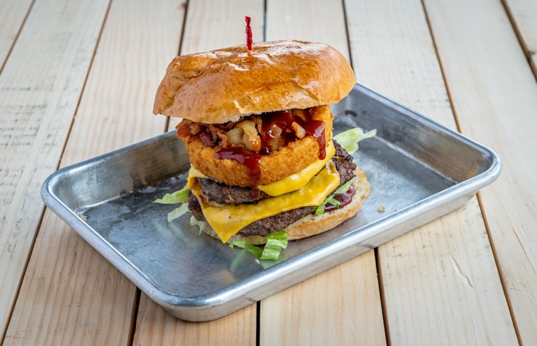 Our homemade burger piled high with fried onions, waffle fries, bacon and nacho cheese.