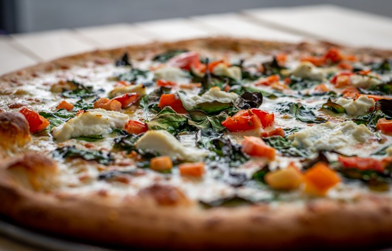 A fresh garlic and oil base topped with spinach, tomatoes, ricotta cheese, and mozzarella cheese.