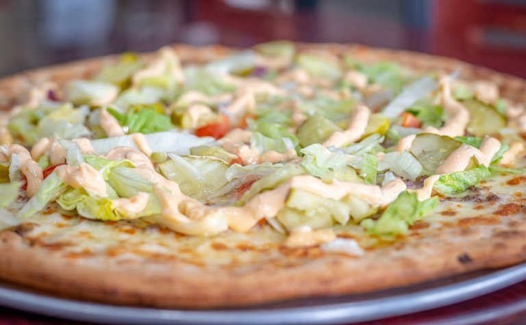 Ground beef, tomatoes, onions, pickles, lettuce, and creamy mac sauce!