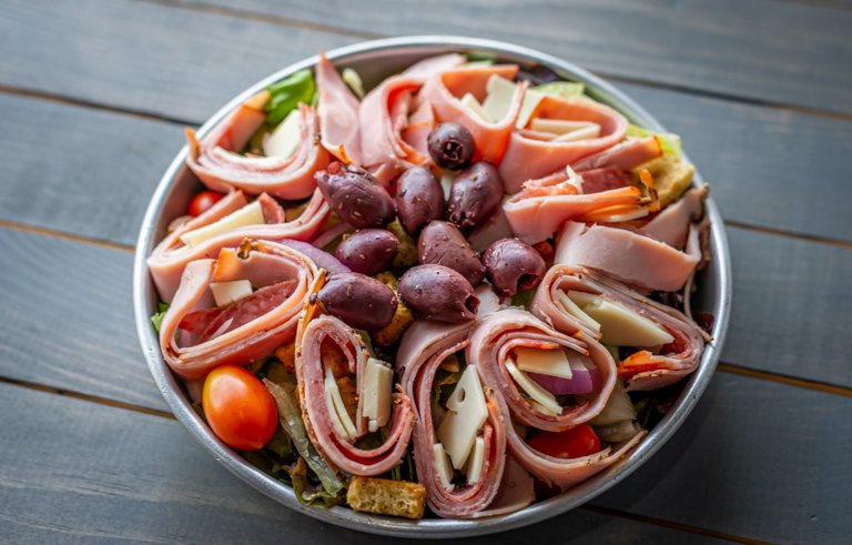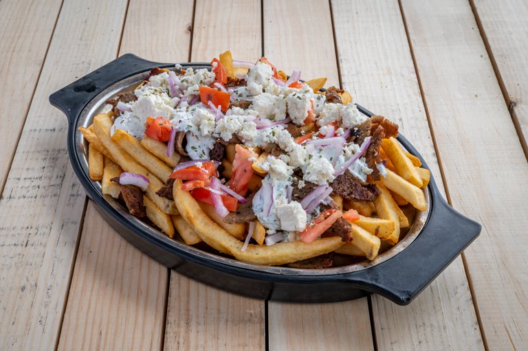 Fresh garlic, oil, gyros meat, feta, tomatoes, red onions, and black olives.