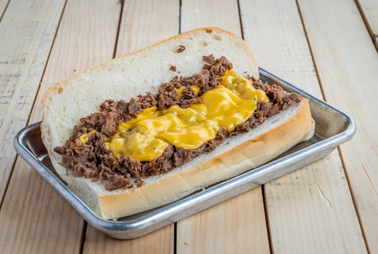 Ribeye steak meat topped with american cheese on a toasted roll.